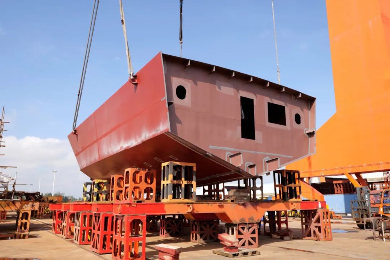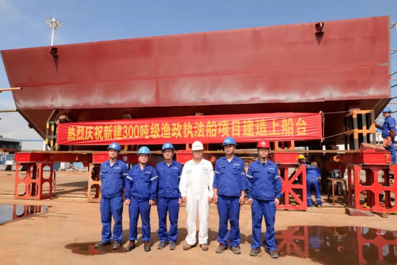 10月8日,由武昌造船為連云港市海洋與漁業(yè)綜合行政執(zhí)法支隊打造的新建300噸級漁政執(zhí)法船,在監(jiān)理、項目三總師及參建單位相關負責人的見證下,順利上船臺,標志該船正式進入船臺搭載階段。