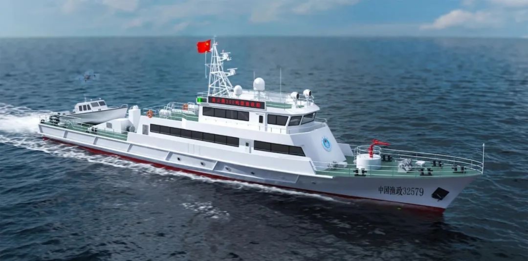 該船總長53米,型寬7.8米,型深4米,采用通長甲板、雙機(jī)、雙槳,直線推進(jìn)方式;作為新一代300噸級漁政船,在繼承以往300噸級漁政船的優(yōu)良耐波性基礎(chǔ)上,配備小艇艉滑道收放系統(tǒng)及12米級高速執(zhí)法快艇,升級水炮執(zhí)法系統(tǒng)、舷側(cè)排氣系統(tǒng);還配備了全船艙內(nèi)外視頻監(jiān)控系統(tǒng)及手持紅外微光融合彩色夜視設(shè)備、全船信息化系統(tǒng)等,綜合性能進(jìn)一步提升。