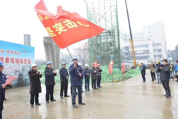 2月20日上午,在寶豐北路項目建設工地,湖北省國防工會、武漢市總工會、武漢市國防科研工會聯合武船集團舉行2019年第一場“迎接軍運會 建功軍運會 服務軍運會”立功競賽活動啟動儀式。