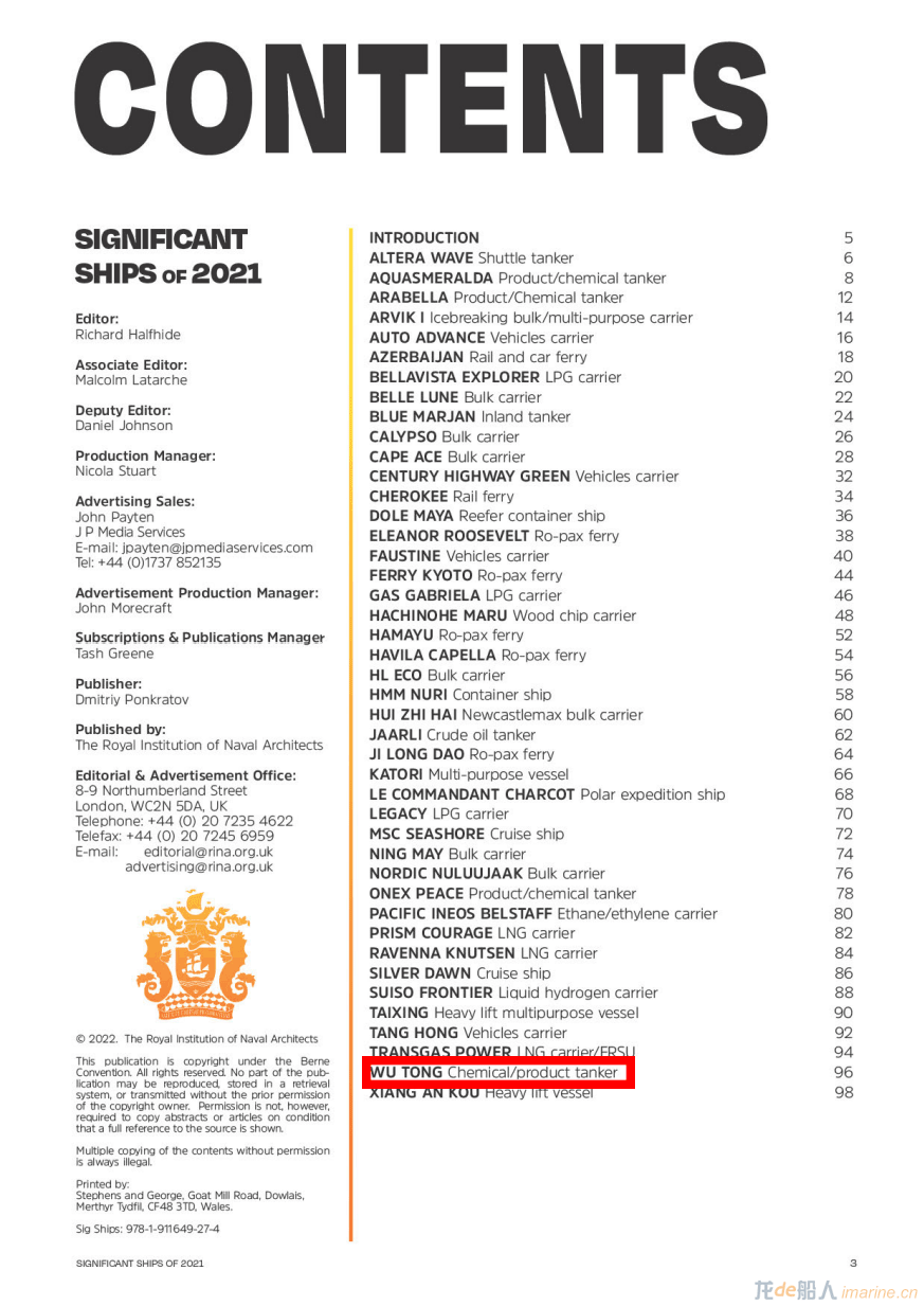 近日,英國皇家造船工程師協(xié)會發(fā)布了2021年度杰出船型名錄《SIGNIFICANT SHIPS OF 2021》,收錄了全球各船廠去年交付的43型杰出船型。其中,由中國船舶武船集團建造的7200載重噸雙相不銹鋼化學(xué)品船“梧桐”輪榮列其中。