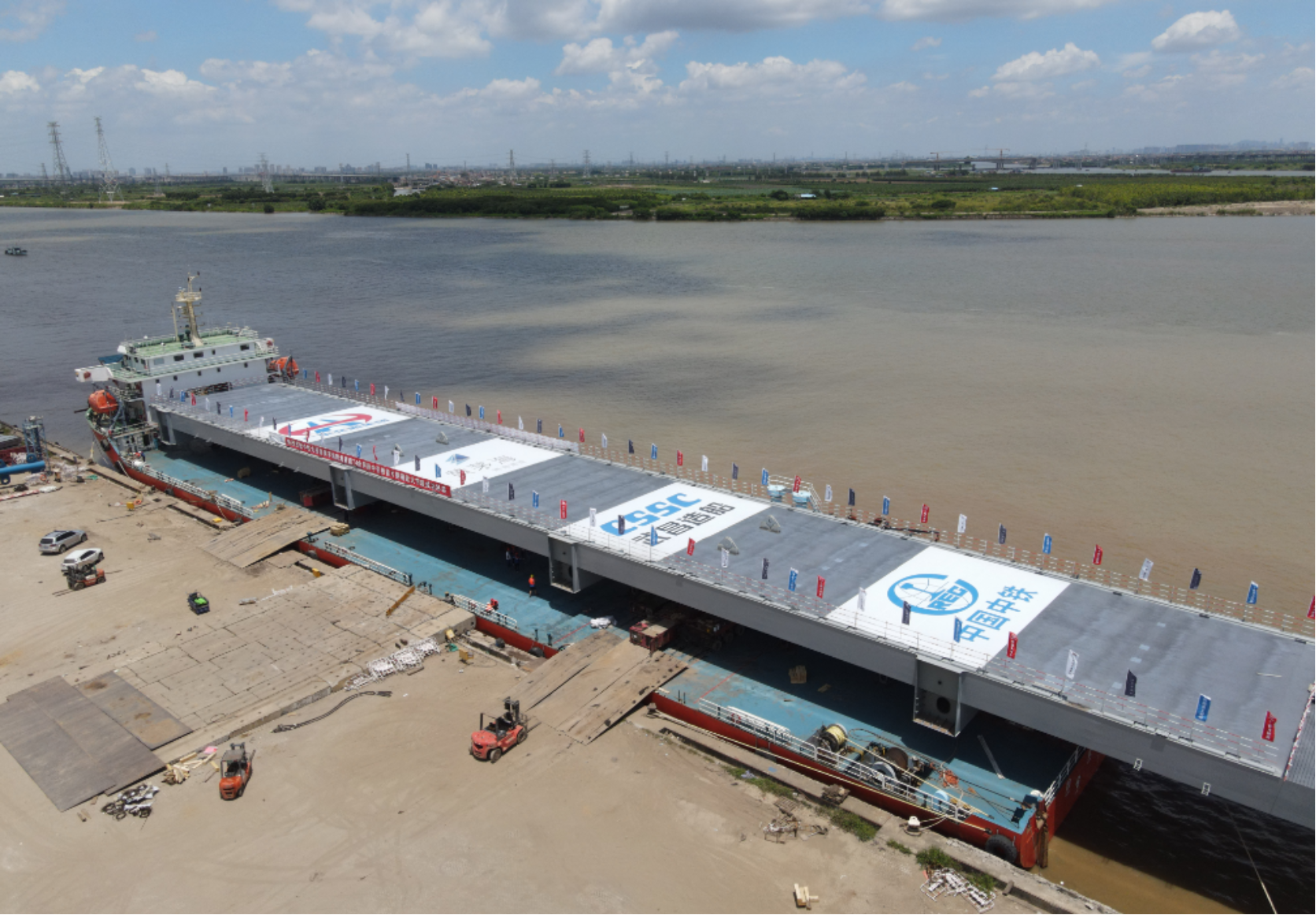 中國船舶集團武昌造船重工公司承接的黃茅海跨海通道G2合同段中引橋為為1600米鋼箱連續梁橋,左右幅分離,鋼箱梁大節段共32節,現場采用半幅大節段吊裝方式進行吊裝。本次吊裝的大節段長123米、寬18.75米、高4米、重1340噸,是全橋最大、最長、最重的6節大節段之一。
