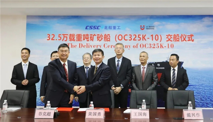 9月10日,由中國船舶武船集團(tuán)北船重工為裕民航運(yùn)股份有限公司建造的32.5萬噸礦砂船?C?C“裕元”輪順利交付。船東、船廠等各方代表在青島、臺(tái)北、新加坡三地以視頻連線的形式,參加了“云交付”儀式。