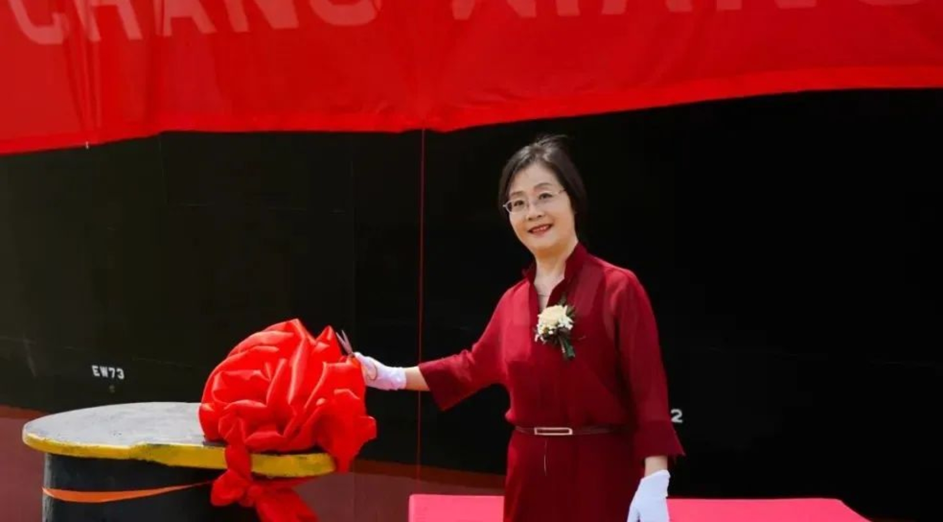 ▲招商局南京油運(yùn)股份有限公司徐萍女士擔(dān)任新船教母,將其正式命名為“長祥洲”輪,并為新船剪纜