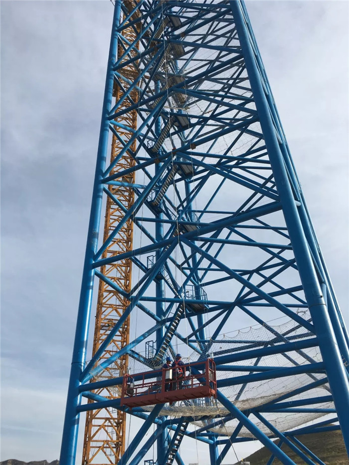 最驚險(xiǎn)的,是在試驗(yàn)過(guò)程中,離地84m的一個(gè)導(dǎo)向輪,因高空風(fēng)力過(guò)大,導(dǎo)致結(jié)構(gòu)受力不均,便隨著鋼絲脫槽而出,項(xiàng)目臨時(shí)黨支部的小伙不得不連夜進(jìn)行“高空鋼管行走”安裝作業(yè),以確保第二天試驗(yàn)的正常進(jìn)行。