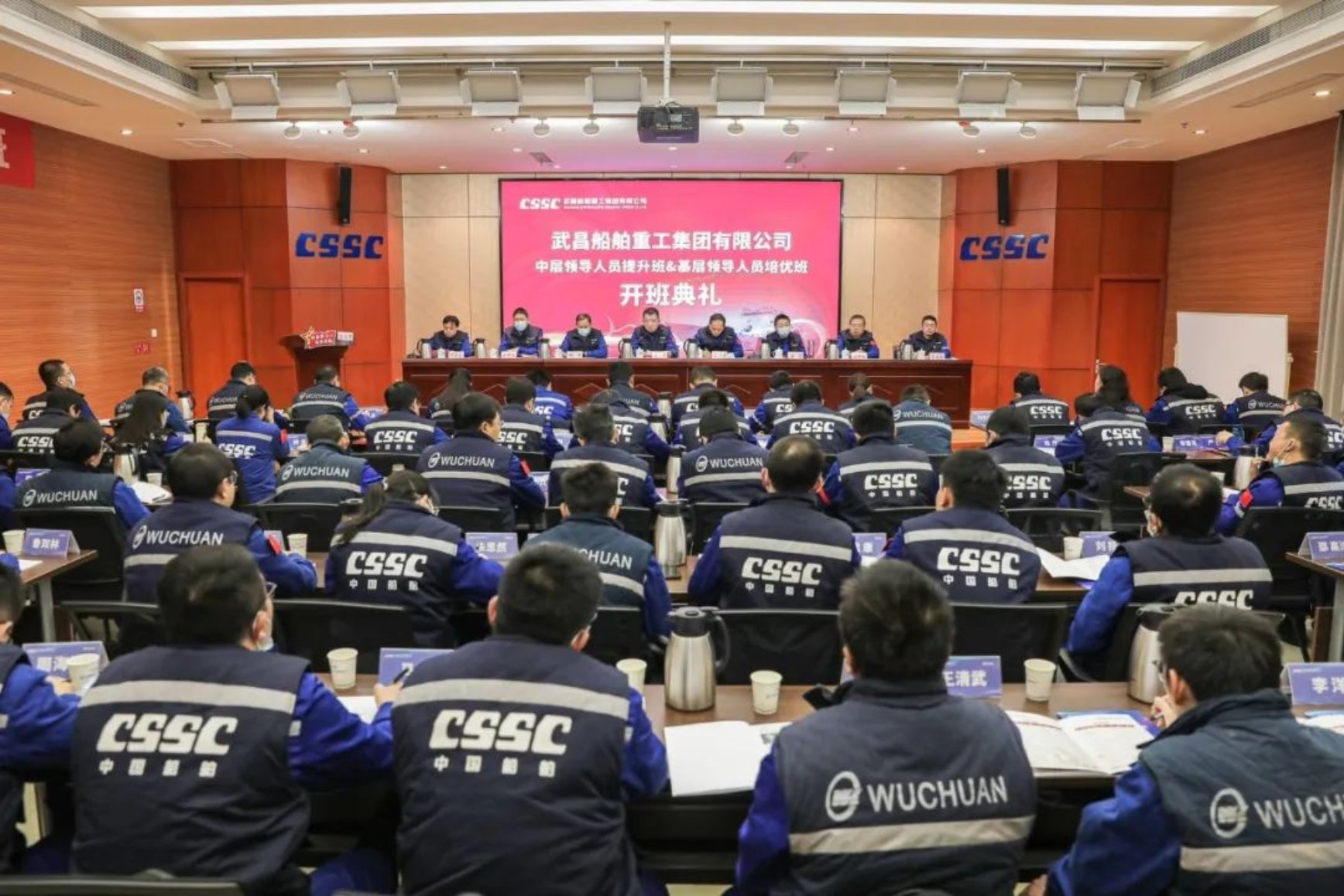 12月2日,武船首屆中層領導人員提升班、基層領導人員培優班開班儀式在創新樓12樓武船講堂順利舉行。公司黨委書記、董事長姜濤,黨委副書記、總經理梁師清,黨委委員、副總經理田軍,黨委委員、副總經理、總工程師唐瀅,黨委委員、總會計師陳仲明,黨委委員、紀委書記左照海,黨委委員、黨委工作部部長李建操出席開班儀式,開班儀式由公司保密總監、人力資源部部長何道遠主持,中層領導人員提升班、基層領導人員培優班共計96名學員參加開班典禮。