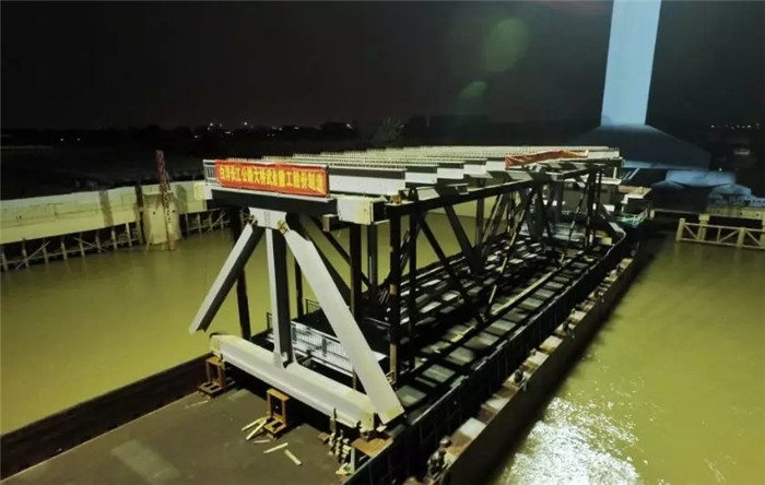 ▲白洋長江大橋主橋首個鋼桁梁節(jié)段裝船發(fā)運