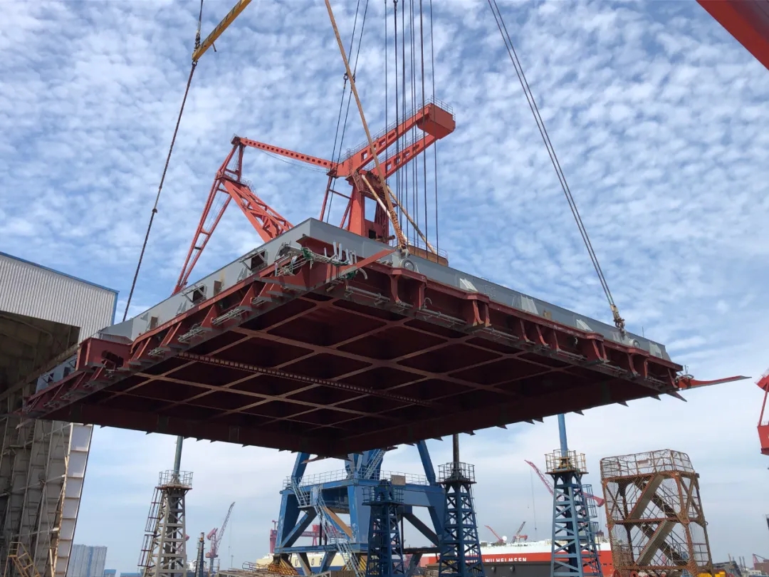 7月4日,武船集團北船重工在建的32.5萬噸系列礦砂船11號船七號貨艙艙口圍分段連同艙口蓋順利完成一體化塢內(nèi)搭載吊裝作業(yè)。這是繼10號船四號貨艙艙口圍分段無艙蓋整體吊裝后的第二次技術(shù)迭代,標志著武船集團北船重工攻克了艙口圍一體化建造吊裝方案、精度控制、地面調(diào)試等主要難關(guān),在實施工序前移、提高艙口圍分段舾裝完整性等精細化管理實踐中再獲突破。