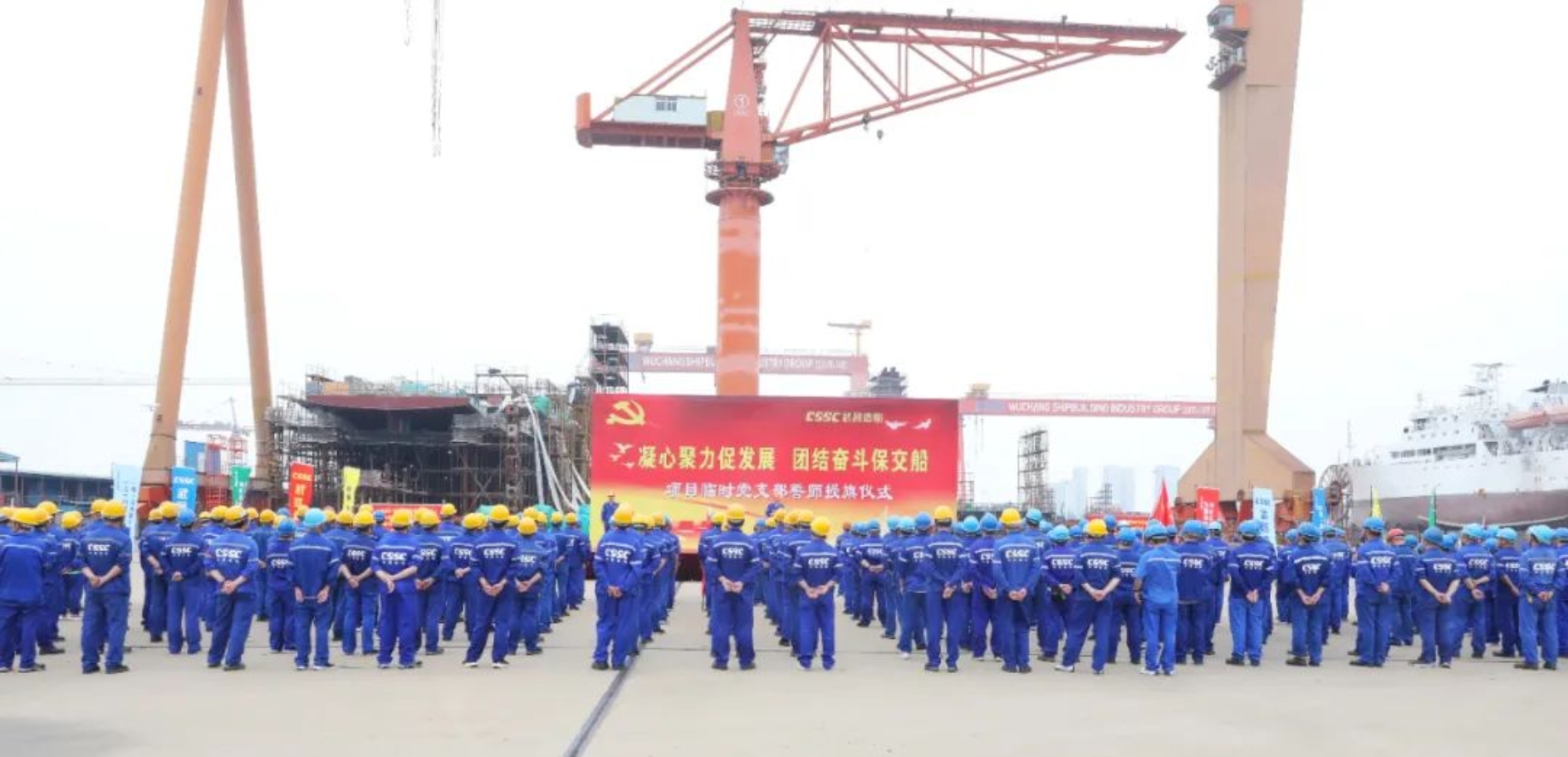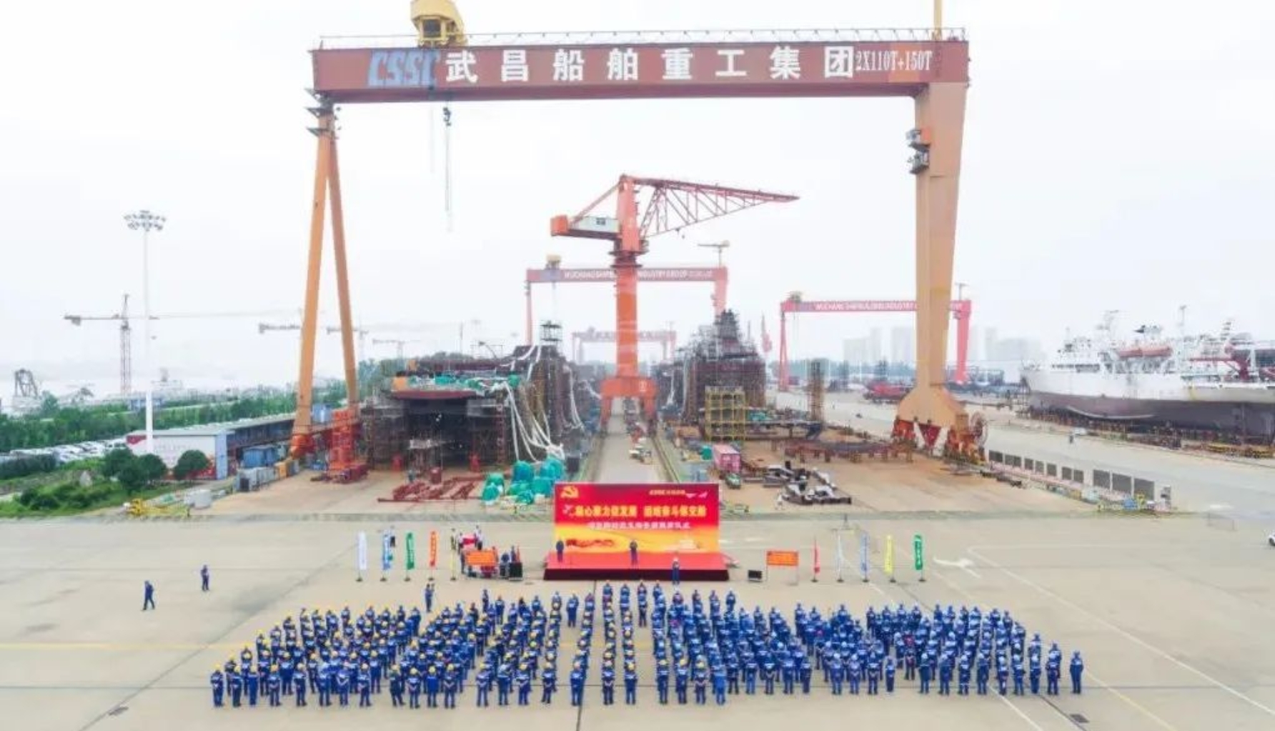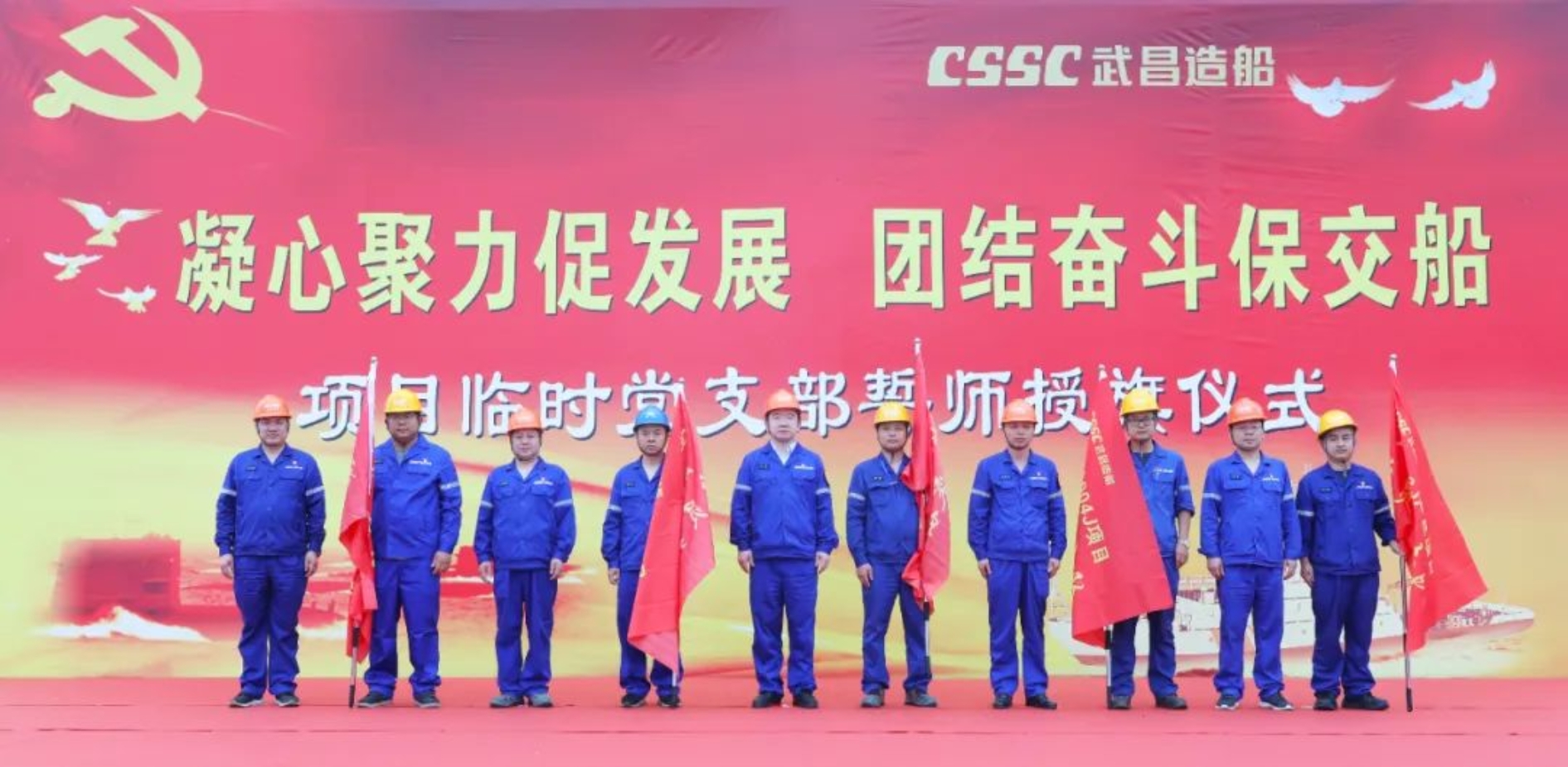 為加快公司高質(zhì)量發(fā)展,以大項(xiàng)目黨建為載體,全力保障重點(diǎn)產(chǎn)品節(jié)點(diǎn)任務(wù)實(shí)現(xiàn),以錨定目標(biāo)真抓實(shí)干推動(dòng)學(xué)習(xí)貫徹習(xí)近平新時(shí)代中國(guó)特色社會(huì)主義思想主題教育走深走實(shí),2023年6月16日早上7點(diǎn)45分,中國(guó)船舶集團(tuán)武昌造船以“凝心聚力促發(fā)展 團(tuán)結(jié)奮斗保交船”為題舉行項(xiàng)目臨時(shí)黨支部誓師授旗儀式。公司領(lǐng)導(dǎo)姜濤、梁師清、田軍、唐瀅、陳仲明參加儀式并向10個(gè)項(xiàng)目臨時(shí)黨支部授旗。公司10個(gè)重點(diǎn)項(xiàng)目臨時(shí)黨支部成員、參建黨員、職工,軍工部、生產(chǎn)管理部、設(shè)計(jì)院等18家單位中層管理人員參加儀式。