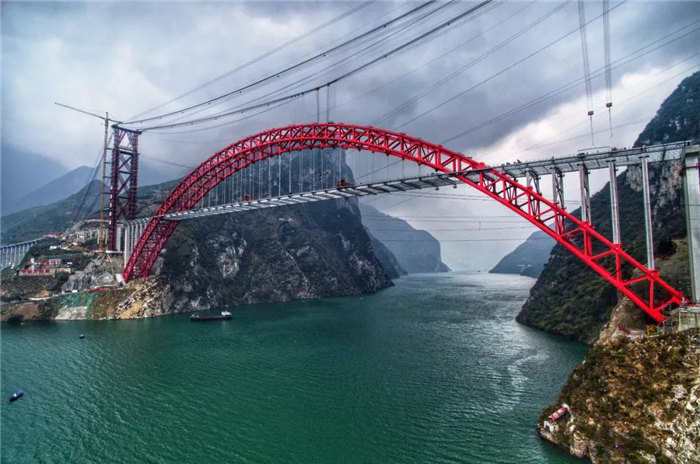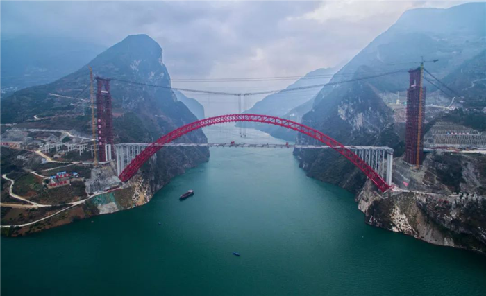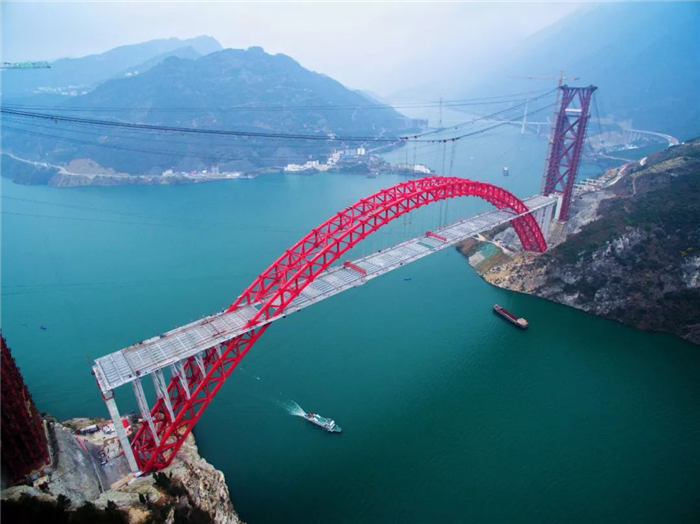 香溪長江公路大橋位于湖北宜昌秭歸兵書寶劍峽峽口,橋梁主跨531.2米,橋面寬32.3米,是目前世界最大跨度的鋼箱桁架推力拱橋,大橋在今年5月22日實現(xiàn)了主拱合龍,8月30日拱上立柱吊裝完成,隨后開始架設(shè)鋼主梁,主梁架設(shè)歷時約4個月。本次合龍段施工包括2根主縱梁、7根中縱梁、8根橫梁、2塊人行道板施工。
