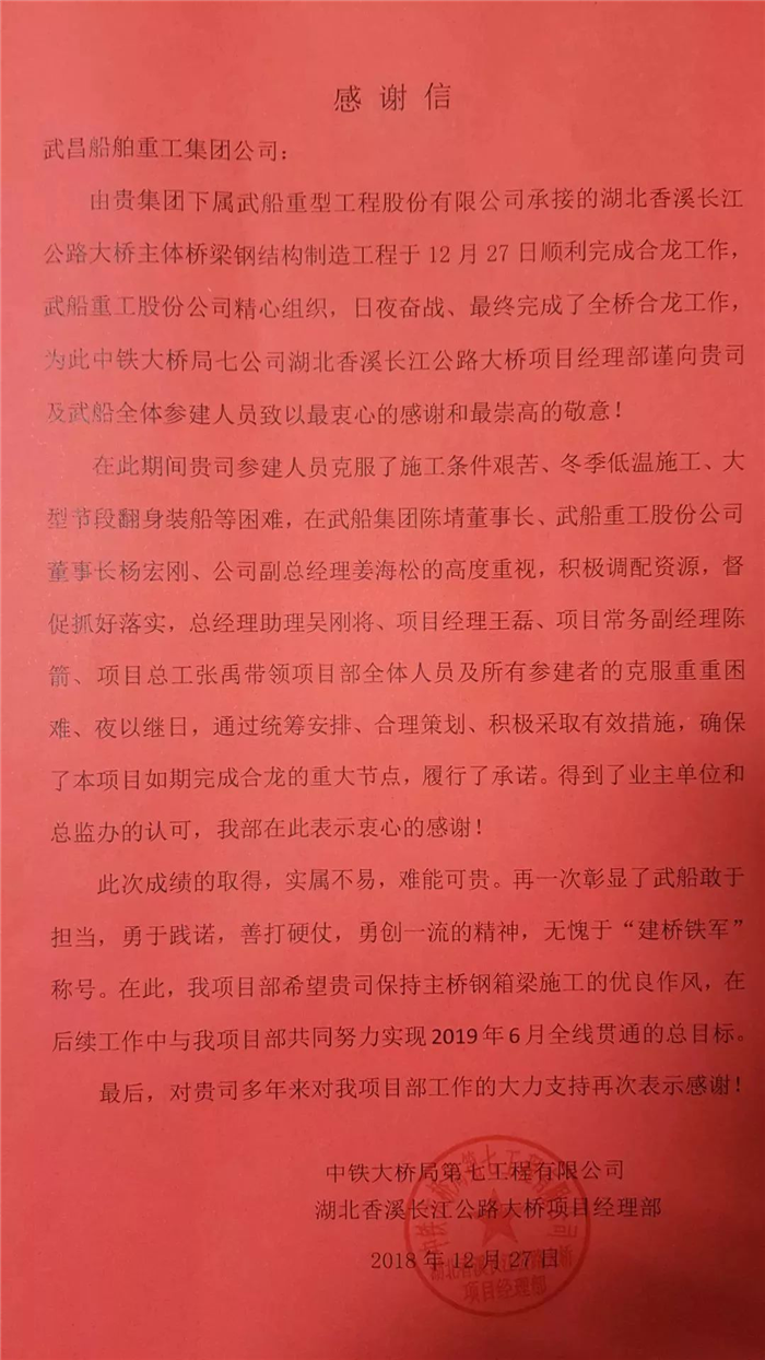 合龍儀式上,香溪長江大橋業(yè)主、總包單位對公司在大橋建設(shè)過程中表現(xiàn)的守信擔當、硬朗作風的工作作風表示高度贊揚,并向武船集團發(fā)來感謝信,同時希望公司能繼續(xù)保持優(yōu)良作風,提前高效地完成后續(xù)工作任務(wù)。