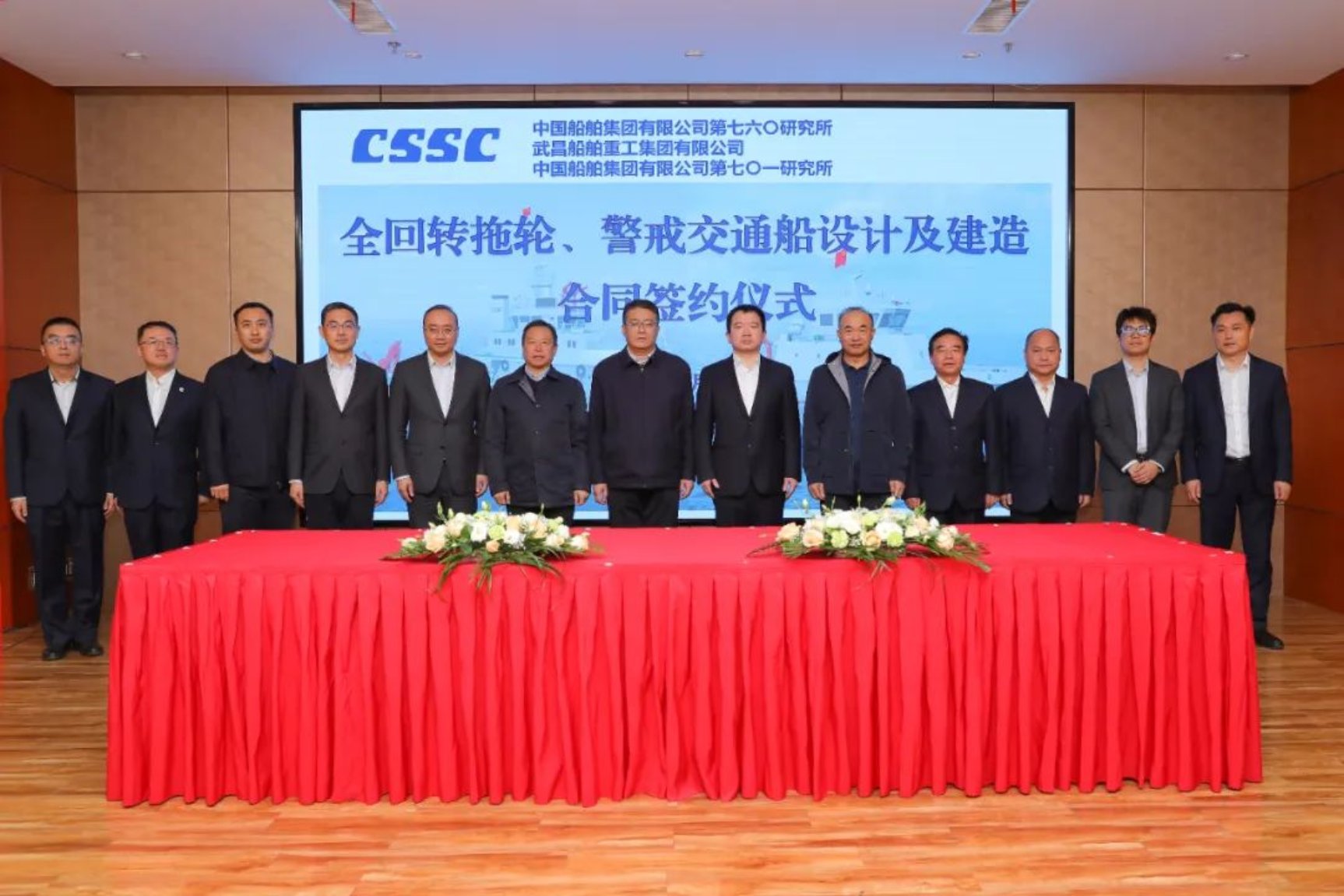 11月30日下午,中國船舶集團(tuán)第七六〇研究所與中國船舶集團(tuán)武昌造船、中國船舶集團(tuán)第七〇一研究所在武昌造船舉行“全回轉(zhuǎn)拖輪、警戒交通船設(shè)計(jì)及建造”項(xiàng)目簽約儀式。