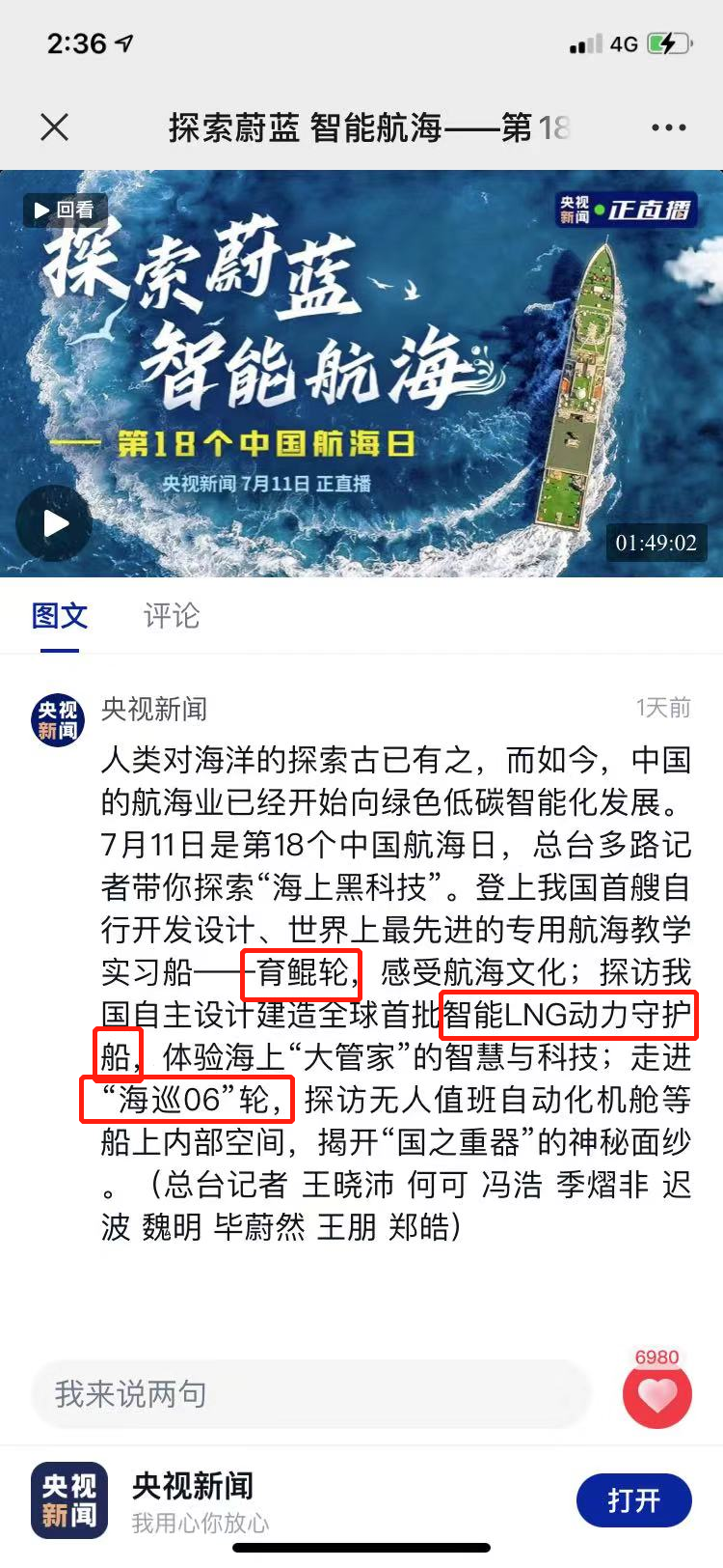今天,在央視新聞客戶端“央視新聞.正直播”欄目由央視總臺(tái)多路記者帶領(lǐng),登上我國首艘自行開發(fā)設(shè)計(jì)、世界上最先進(jìn)的專用航海教學(xué)實(shí)習(xí)船“育鯤輪”;探訪我國自主設(shè)計(jì)建造全球首批智能LNG動(dòng)力守護(hù)船“海洋石油542”;走進(jìn)5000噸級(jí)大型巡航救助船“海巡06”;帶領(lǐng)鏡頭前的觀眾朋友們感受了航海文化,體驗(yàn)了海上“智能大管家”的智慧與科技,揭開了“國之重器”的神秘面紗。