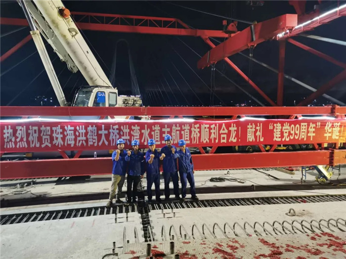 7月1日凌晨,隨著中跨合龍段主縱梁安裝完成,中國船舶武船集團武船重工股份承建的珠海洪鶴大橋洪灣水道主航道橋按期實現高精度合龍,獻禮中國共產黨建黨99周年。