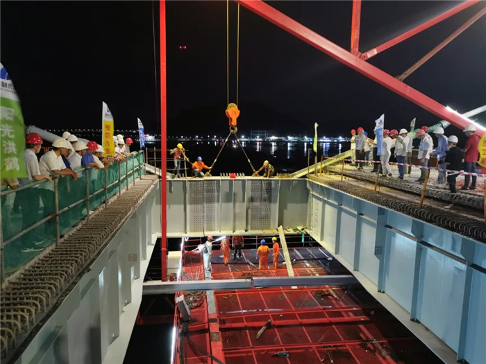春節過后,項目受新冠肺炎疫情影響,工期有所滯后。由于珠海每年7-8月為臺風頻發季節,如不能按原計劃在6月底實現全橋合龍,將大大增加施工安全風險。在業主、總包單位的大力支持下,在武船重工股份的統籌安排和努力下,抽調非湖北籍的項目人員和施工人員返崗,在2月22日實現復工復產。復工以后,武船重工股份倒排工期,圍繞預期目標開展黨員示范工程項目和專項勞動競賽,優化資源配置和人員安排,在確保質量和安全的前提下搶抓工期,最終在臺風季來臨之前實現了全橋合龍。